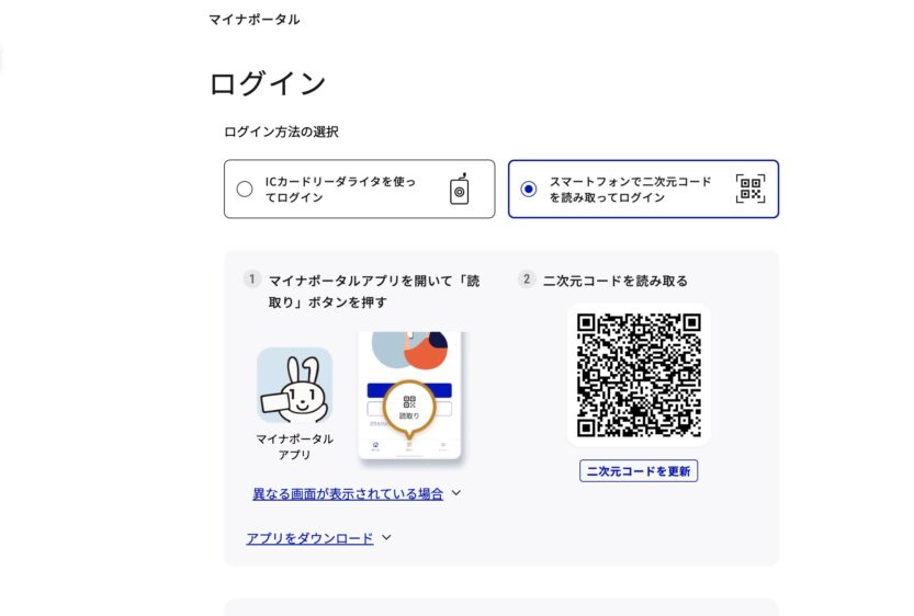 このPC画面の二次元コードをiPhoneのマイナポータルアプリを開いて『二次元コードの読み取り』