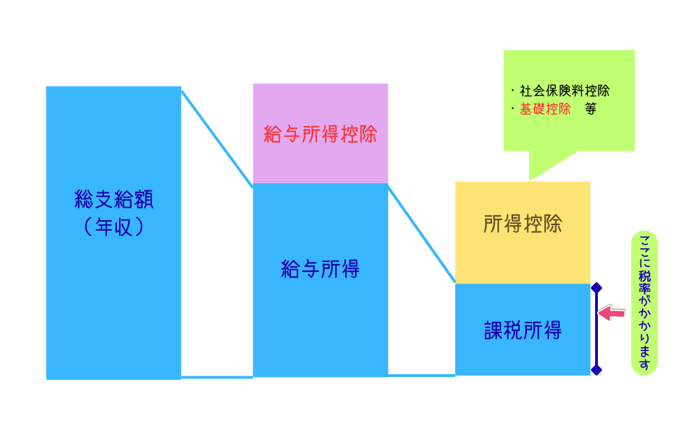 総支給額(年収) ー 給与所得控除(サラリーマンの経費:65万円〜)
