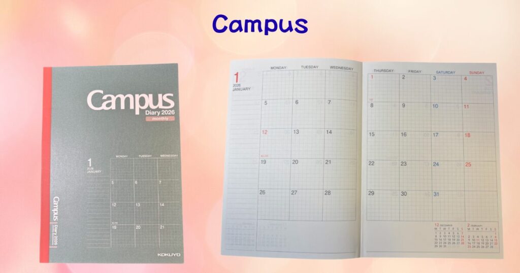 以前使っていたほぼ日のマンスリーの部分が好きだったのですが、どうせ持ち歩かないのだからマンスリーだけの薄い手帳を探して、Campus Diary 2026 monthlyを購入しました。